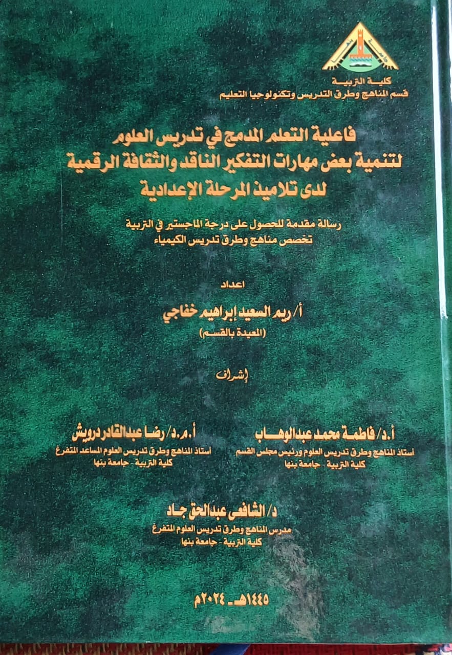 | فاعلية التعلم المدمج فى تدريس العلوم لتنمية بعض مهارات التفكير الناقد والثقافة الرقمية (رسالة ماجستير) | | | | الرسالة تتناول موضوح مهم وحديث هو مهارات الثقافة الرقمية (Digital Literacy) والتعلم المدمج (Blended Learning) والتفكير الناقد (critical thinking). |